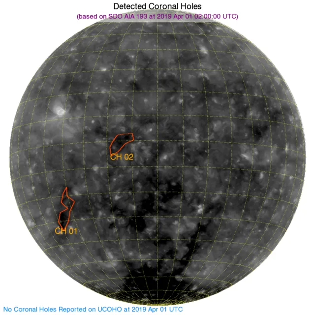 赤道付近東寄りと南半球東側に小さなコロナホールがあります