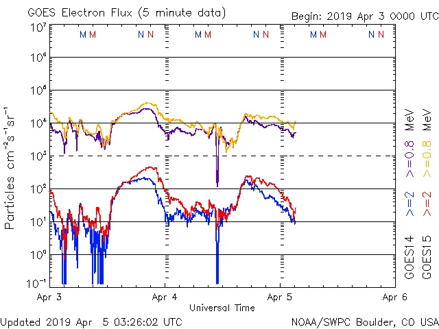 やや乱れたラインが続いています。04/04 11時(UT)頃にピンポイントの強い反応がありました。