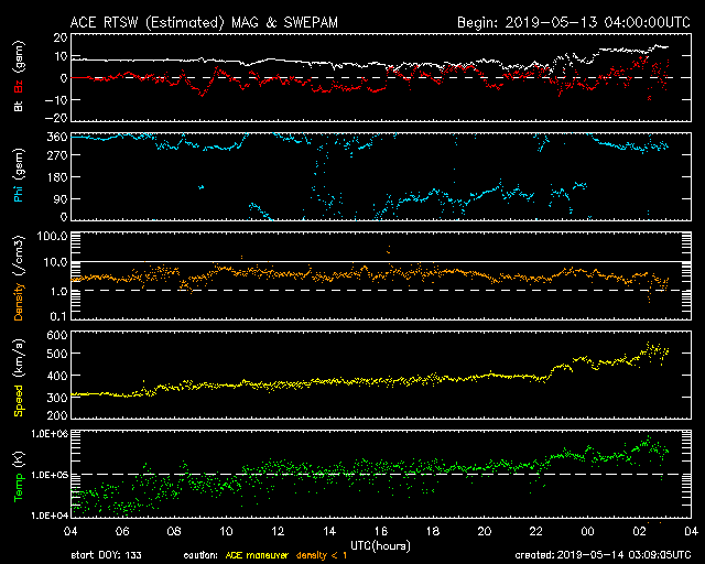 早ければ05/15 11時くらい頃にCMEが到着するかも。(遅い予想だと05/18 9時くらい)