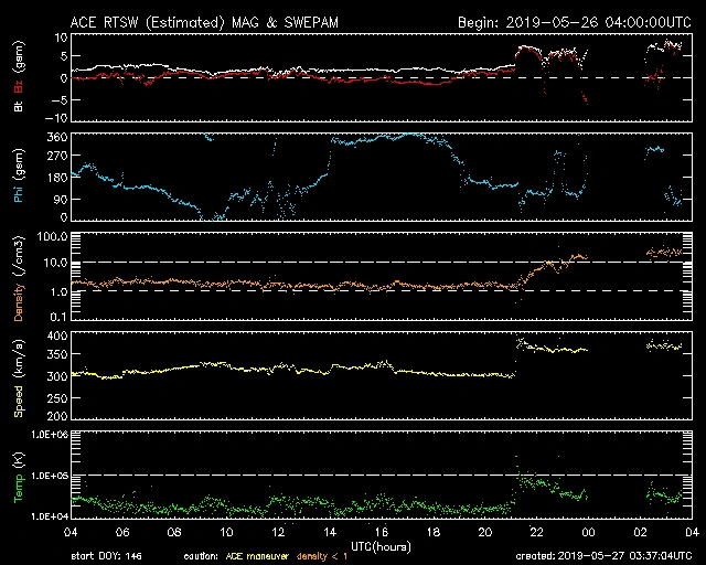 05/27 03時(UT)、やや乱れの兆候があります。この後乱れが出るようなら要注意