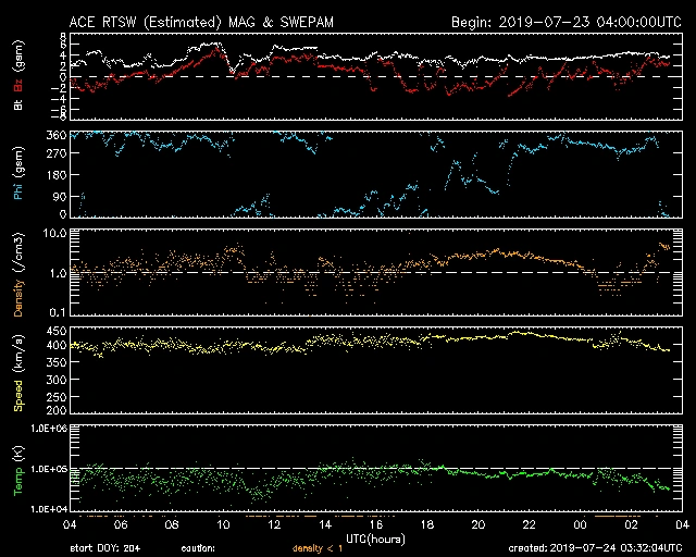 一時440km/s前後まで上がりましたが徐々に下がり、現在380km/s前後で推移しています