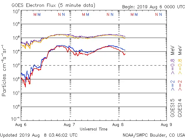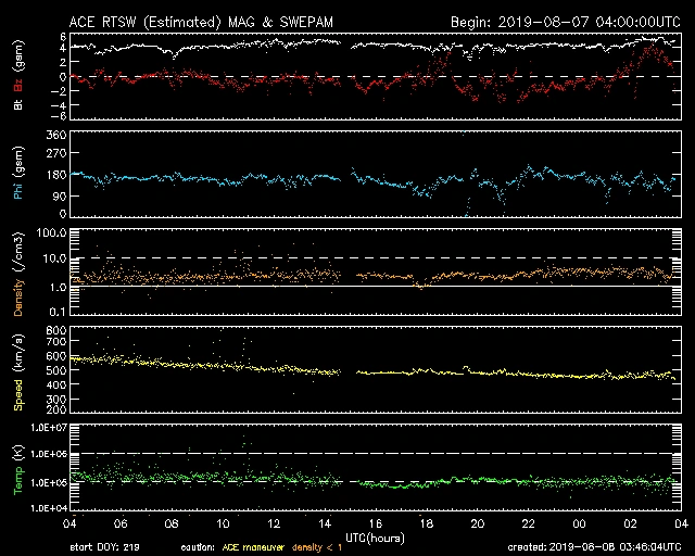 時折700km/sを超える突風が吹いたようです。600km/s前後で推移していましたが徐々に下がり、現在は440km/s前後で推移しています。