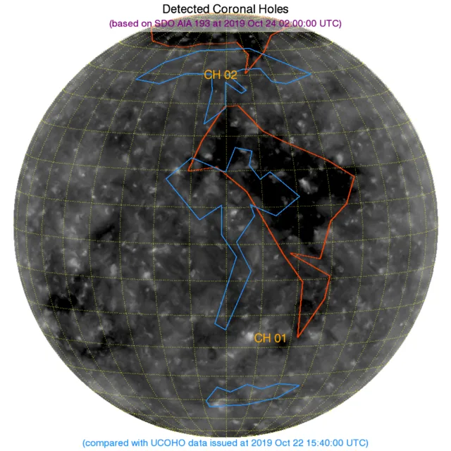 北の極と、赤道を挟んで南北に伸びるコロナホールが正面から西側に広がっています。