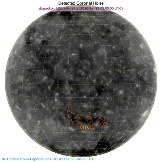 南半球ほぼ正面にコロナホールがあります。こちらの影響が30日か1日くらいから届き始めるかも