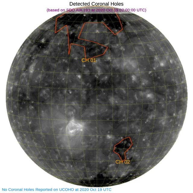 北の極と南半球(やや高緯度)西寄りに小さなコロナホールがあります