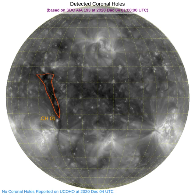 赤道を挟んで南北にのびるコロナホールが東側にあります