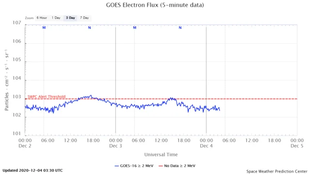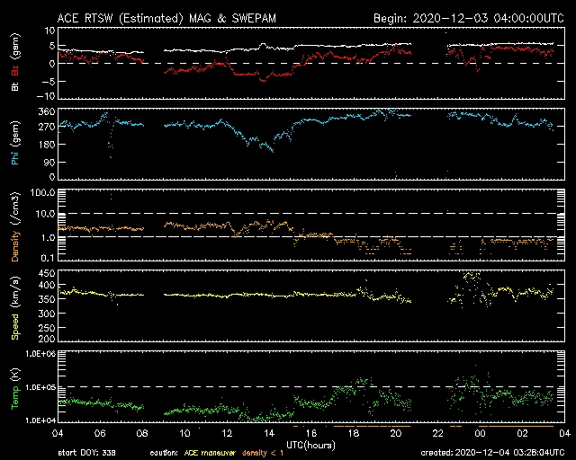 450km/s前後で推移していましたが、日付が変わった頃に速度が上がり現在520km/s前後で推移しています