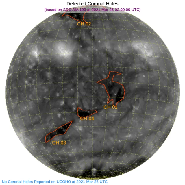 中心付近、南半球東寄り~東端にかけてと、北の極にコロナホールがあります