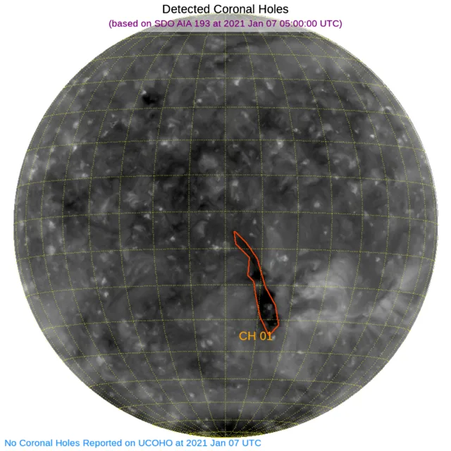 南半球東寄りに南北に細長いコロナホールがあります