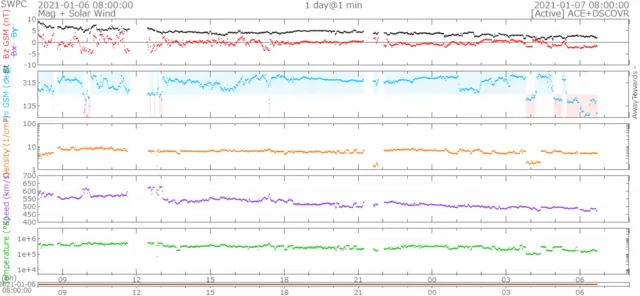 一時650km/s前後まで上がりましたが、現在は470km/s前後で推移しています