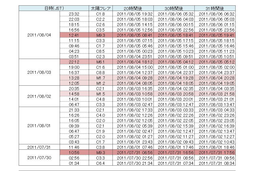 リーマンさんの太陽フレア発生後の注意時刻=CMEの到達時刻なのかどうかいまいちつかめないので、上記表は、目安程度にご利用ください。