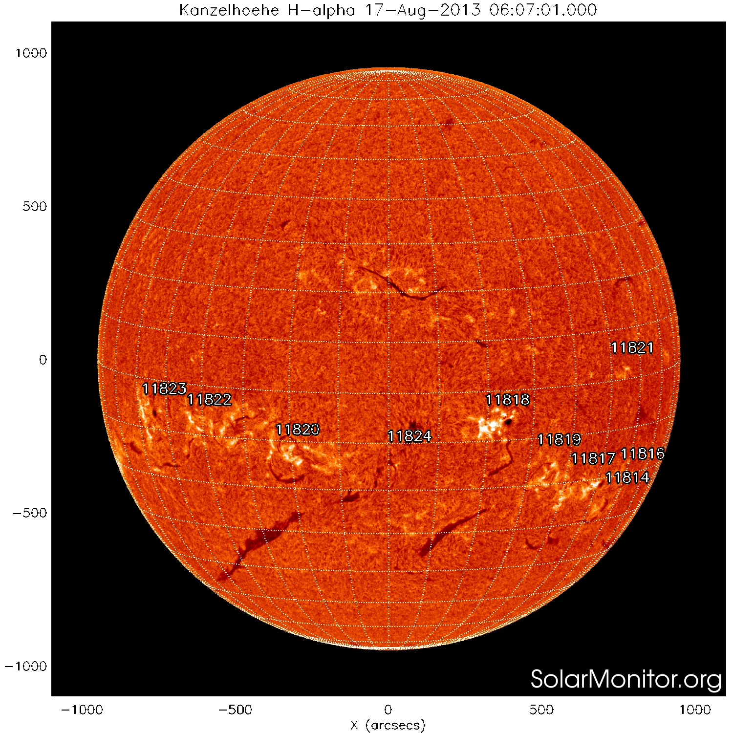 現時点で地球の正面あたりにある黒点群は1820、1824です。←黒点番号が振られていない活動領域でもフレアは発生しますので、あくまで目安として捉えてください。
