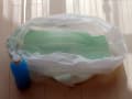 (2)袋の口を切り取り、セット。(左手前にあるのは”疑似尿”。酢でキツめに臭いを付けてあります)