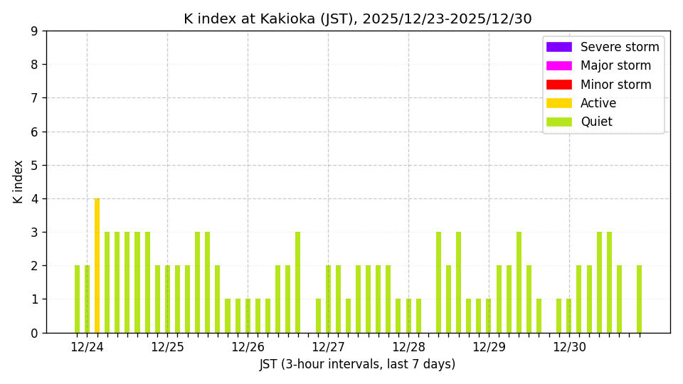 ※3時間ごとのK指数(JST, 過去7日分)。色分けはNICTのアラートレベルに準拠。